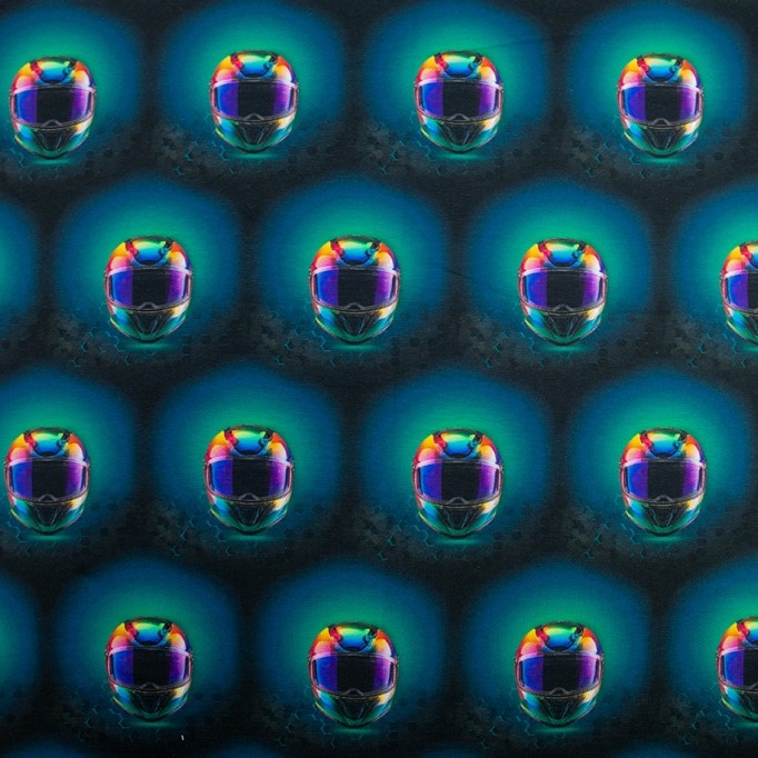 French terry gebrusht blauw met motorhelmen 'Planet Motor'