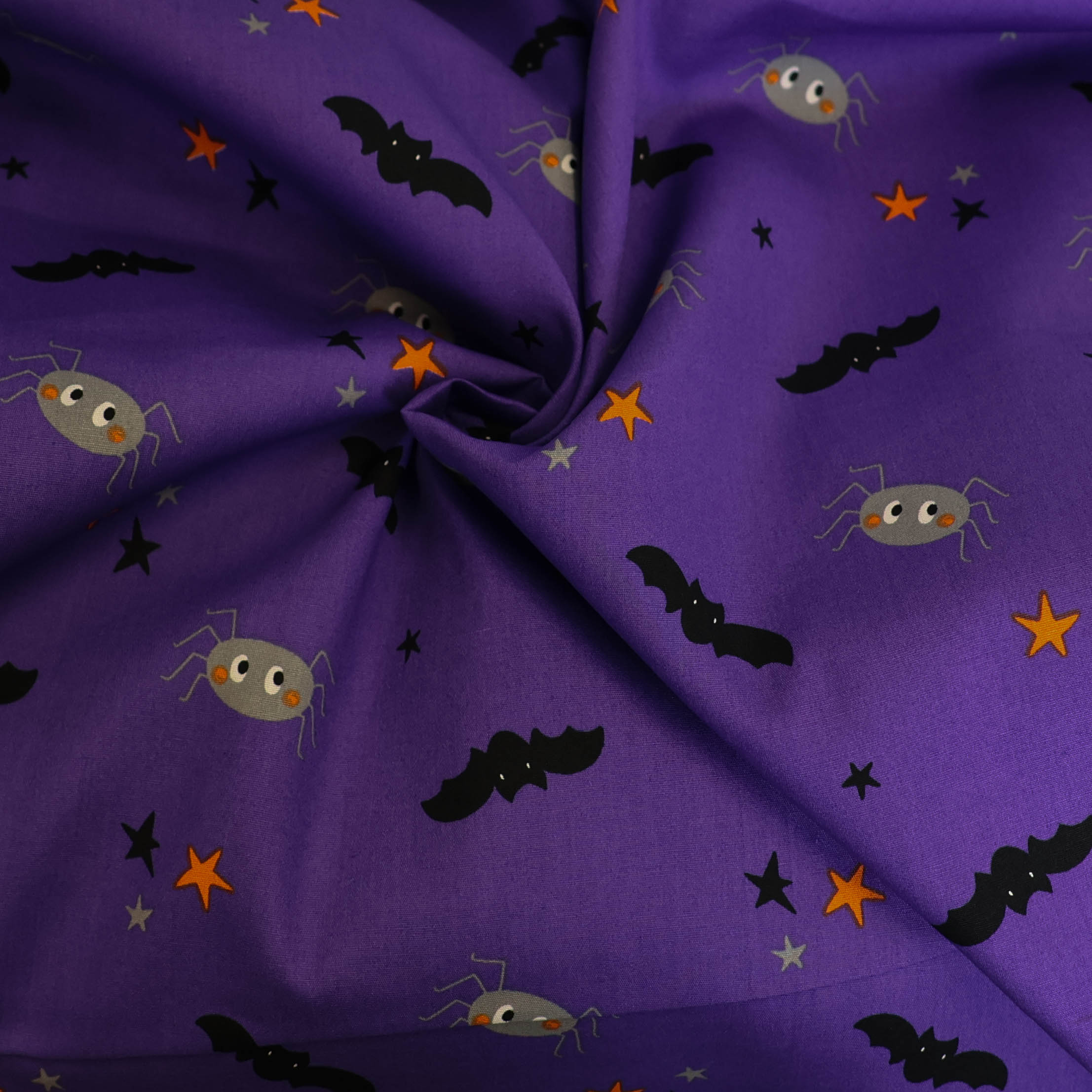 Katoen popeline paars met vleermuizen en spinnen