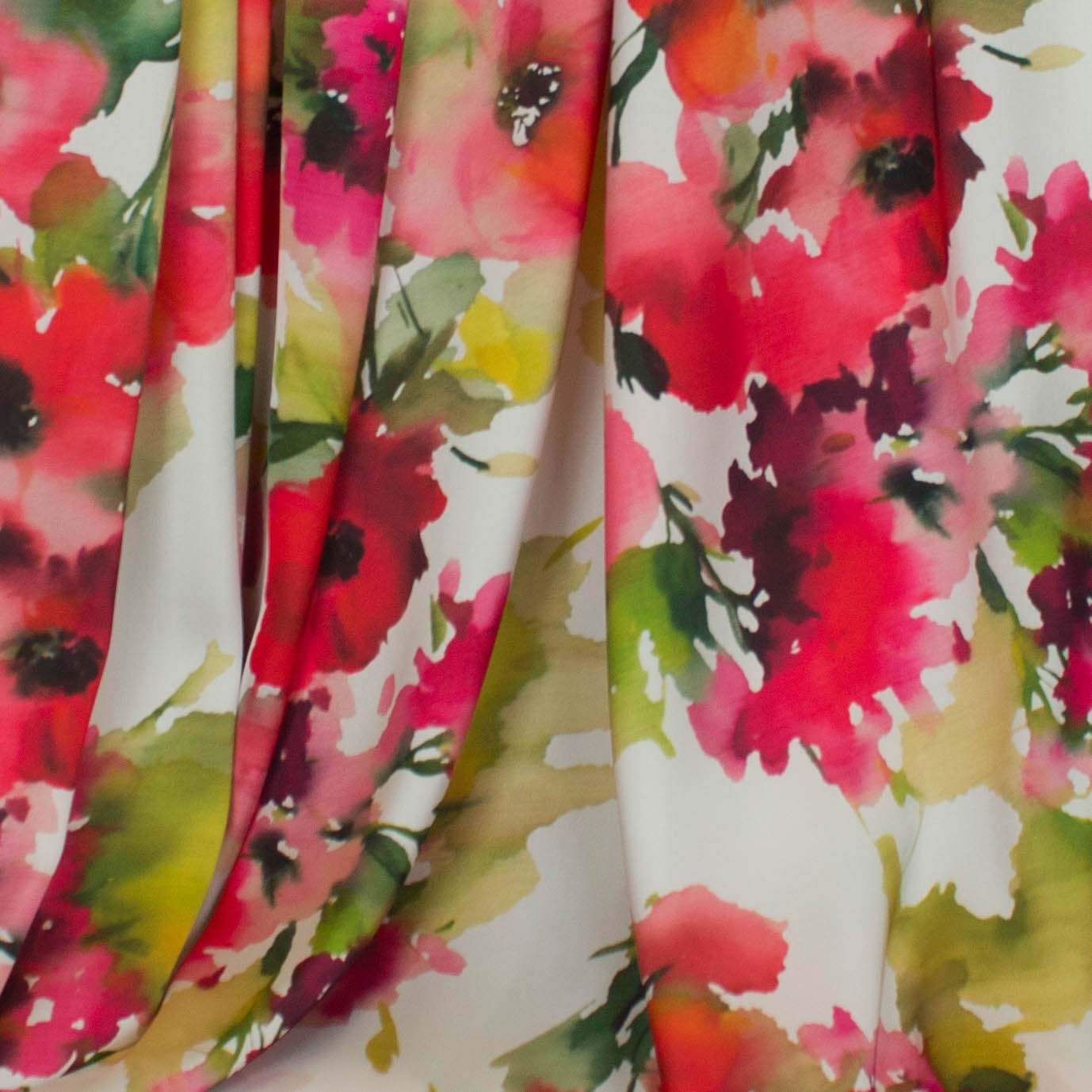 Satijn wit met rode / fuchsia bloemen - Lorré