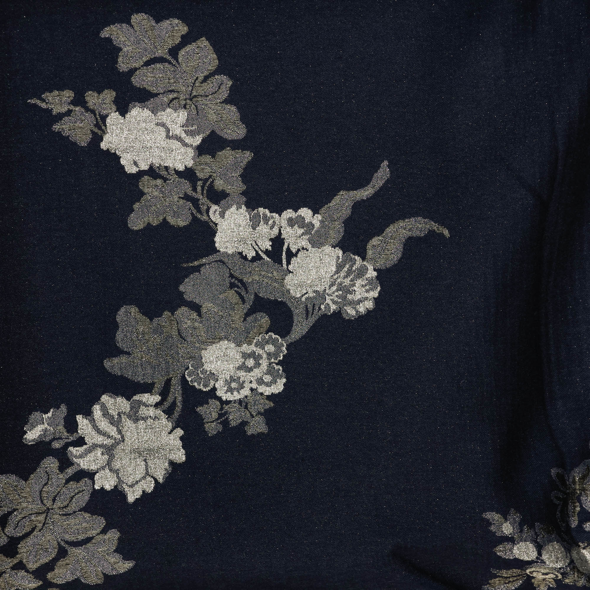 Jacquard blauw met glitter en zilveren bloemen - Knipmode