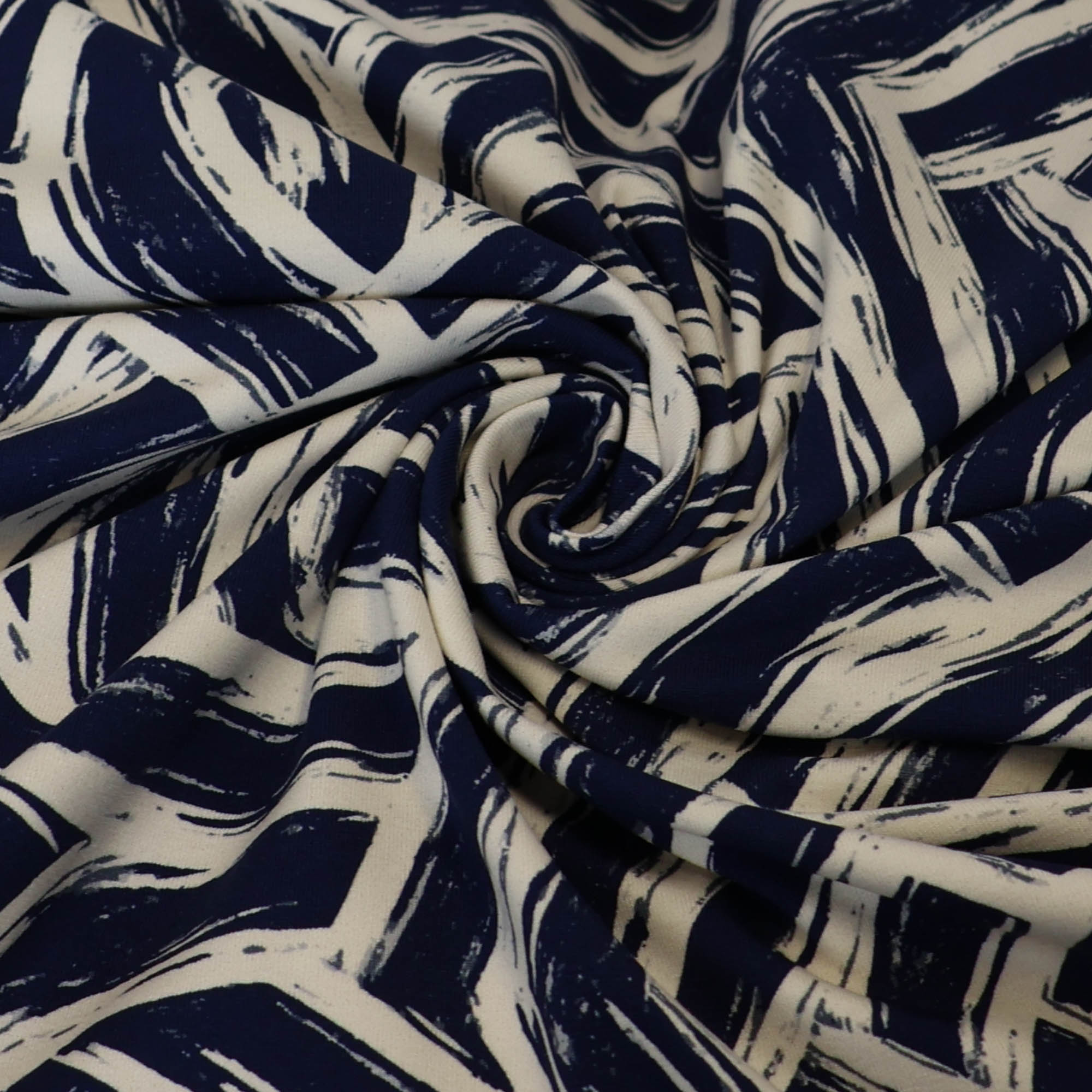 Katoentricot gebroken wit met donkberblauwe vegen