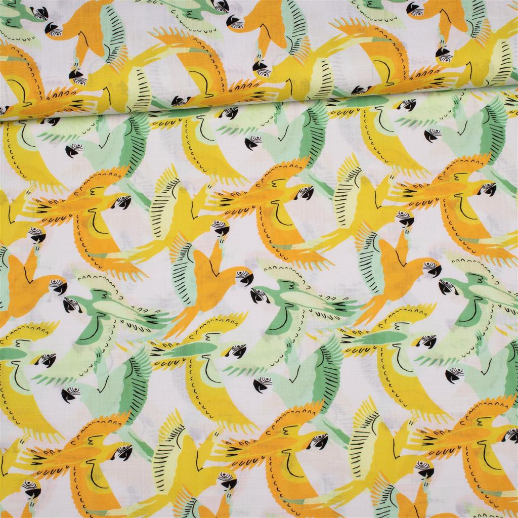 Viscose linnenlook wit met papegaaien