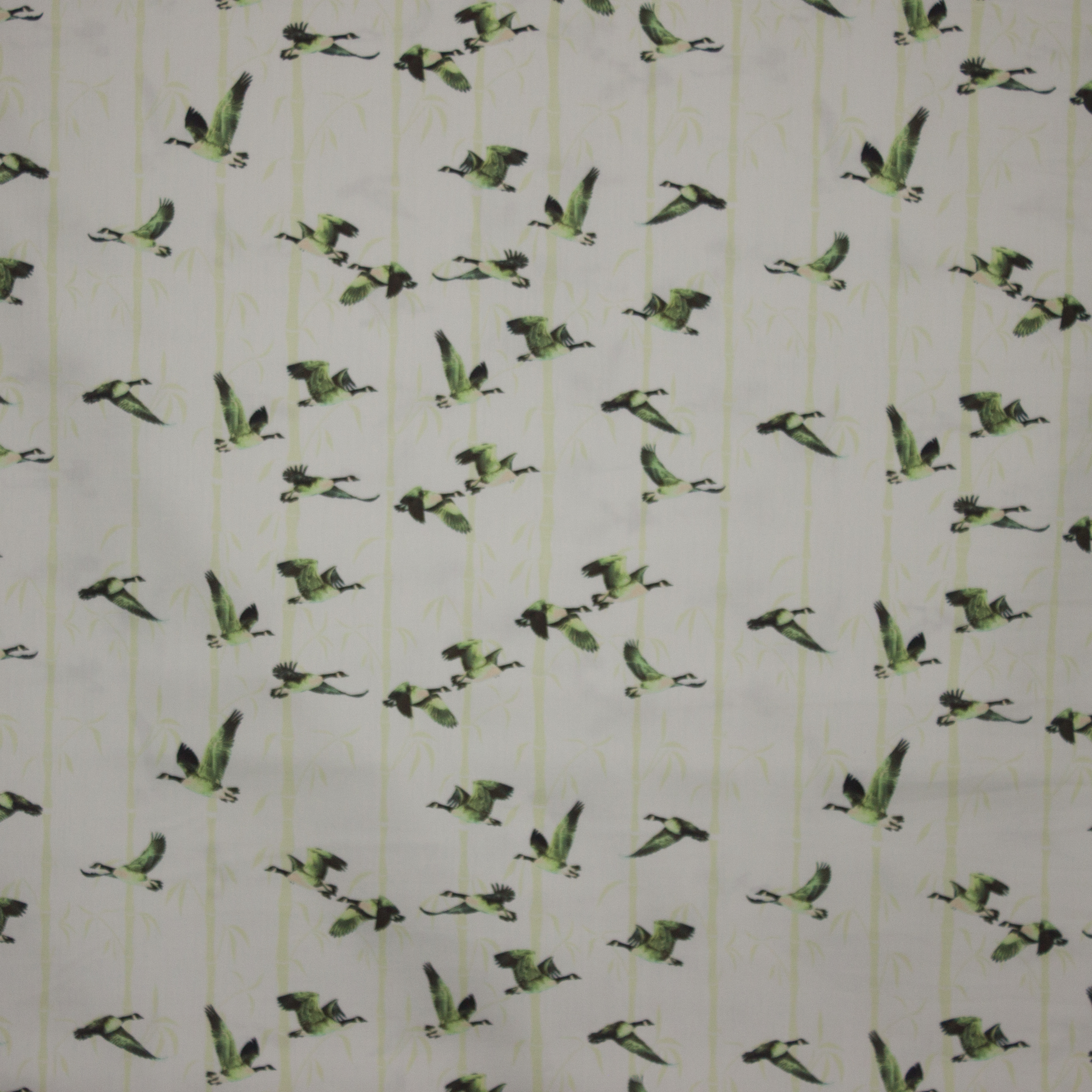 fijne gesatineerde katoen met wilde ganzenprint op ecru achtergrond met een subtiel bamboestreepje in lichtgroen
